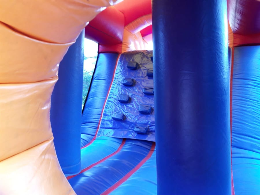 Climb in through the portals, bish and bash your way through the middle and clamber up the climbing wall onto the slide.